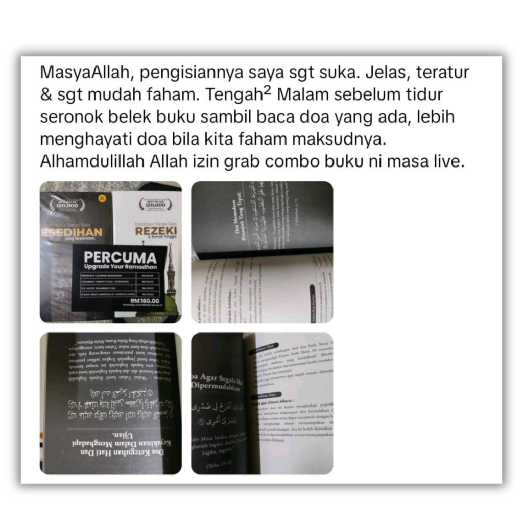 Buku ni bukan sekadar buku, tetapi teman bicara di saat sunyi. Gabungan Tadabbur Al-Quran dan doa-doa khusus untuk merawat luka lama dan membuka pintu kejayaan luar biasa
